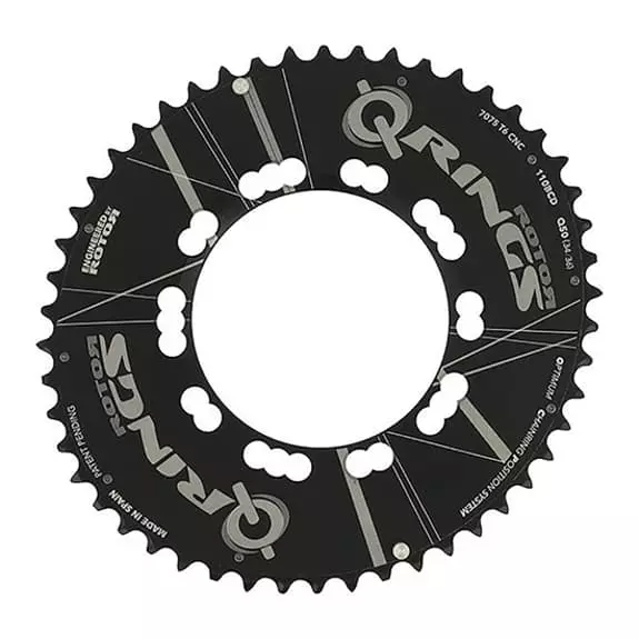 La corona Rotor QRings BCD 110 esterna per le biciclette da corsa ha un’ovalizzazione del 10%. Le corone ovali QRings danno una spinta al tuo rendimento per modificare la resistenza alla pedalata, a seconda della forza e della debolezza naturali delle gambe. Sfruttano al meglio i gruppi muscolari più forti (aumentando il lavoro positivo) e compensano le zone più deboli della pedalata (riducendo la forza negativa).
