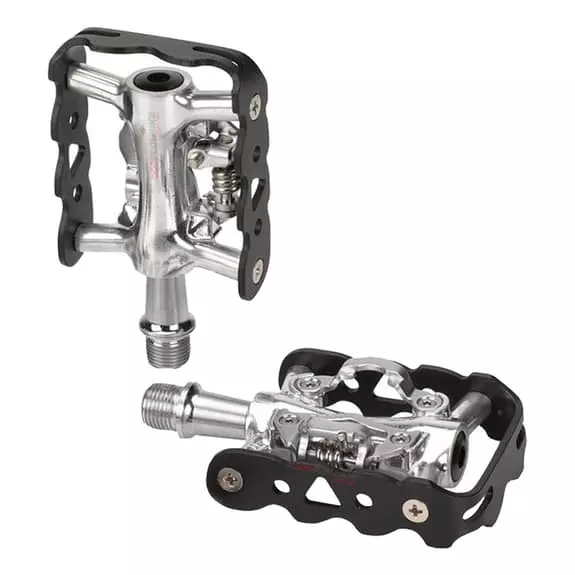 I pedali XLC misti PD-S20 sono adatti per la MTB e per i principianti che non hanno abbastanza esperienza per usare i pedali a sgancio rapido. Per questo motivo, un lato del pedale è un platform convenzionale e l’altro ha una tacchetta automatica per agganciare il piede al pedale. Le tacchette sono SPD compatibili con Shimano.